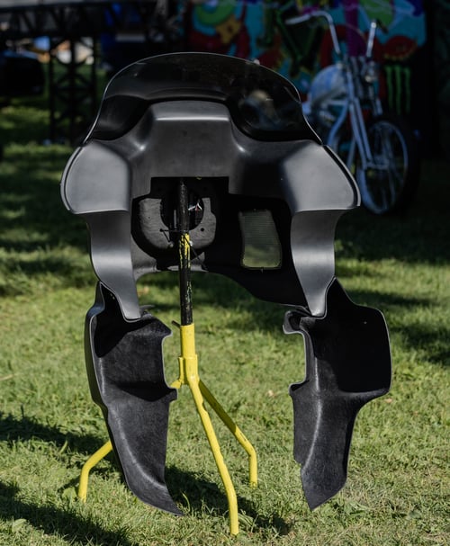 These fairings are the reproduction of the classic FXRT fairings. Closed back has fiberglass that runs the length of the back of the fairing all the way down covering the "glove box" area. These fairing will not accommodate our aftermarket glove boxes. Our "vented" fairing has the original FXRT vents and "no vent" is a shaved front fairing. These are modified to be installed on roadkings, and utilizes the 7 inch headlight. All kits are shipped complete ready to mount.
